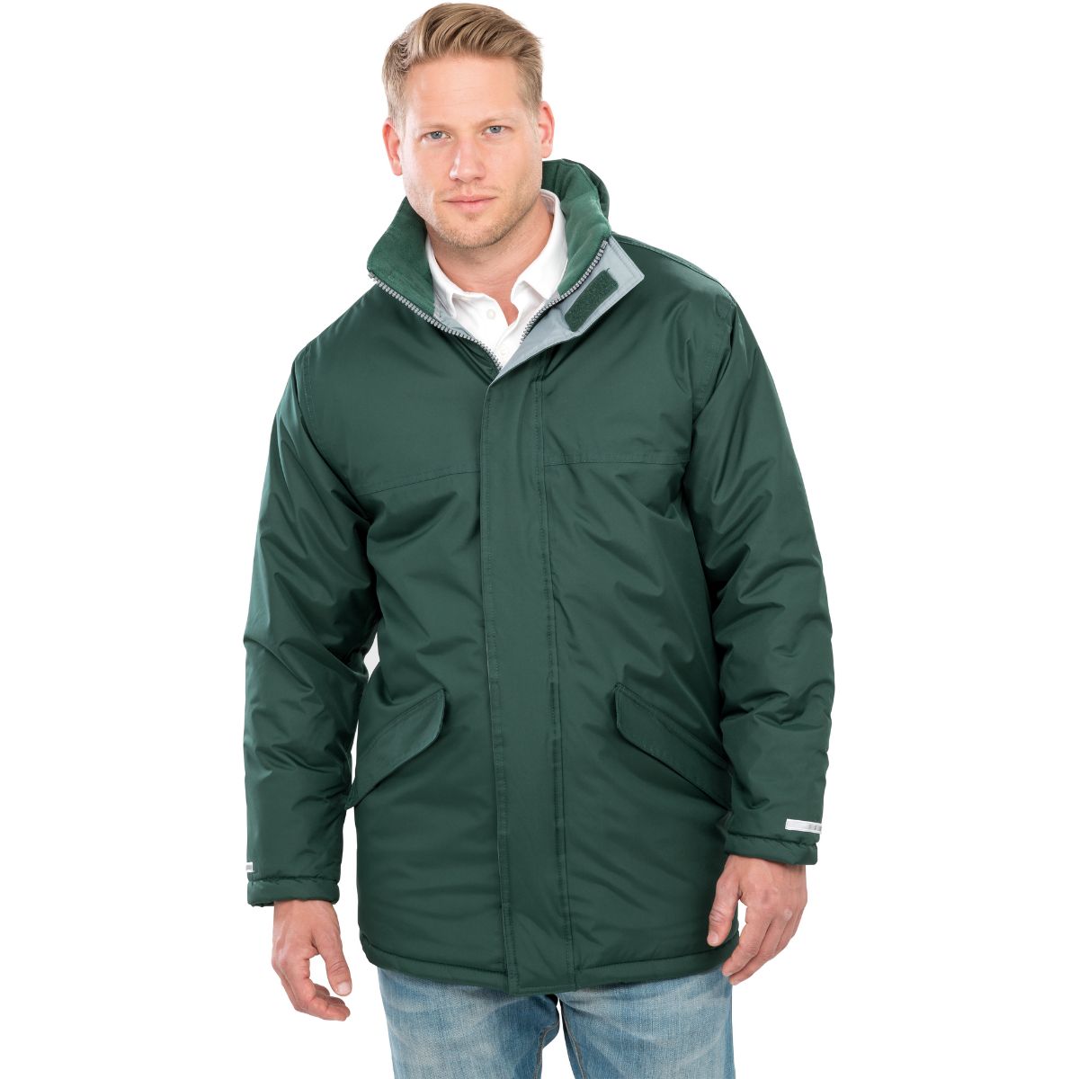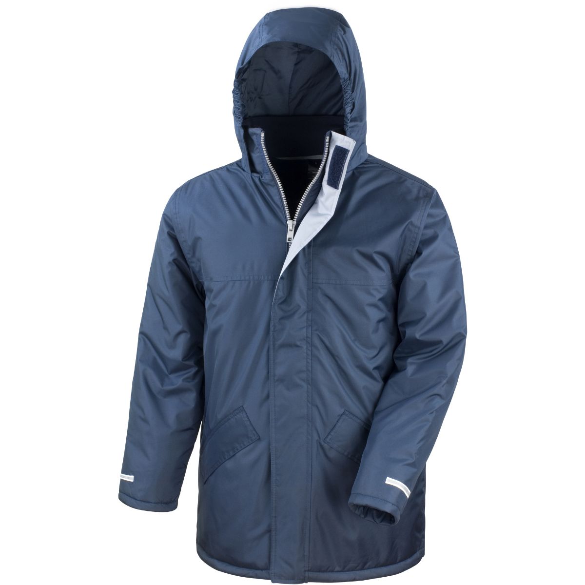 Fleece na vnitřní straně límce, límec se skrytou 3-dílnou kapucí s nastavitelnou šňůrkou, elastické manžety, nastavitelný lem se šňůrkou, větrná ochrana, 2 přední kapsy, vnitřní kapsa, zcela zapečetěné švy, přístup k zušlechtění na zádech a levém prsu, rychleschnoucí, reflexní pás (bez ochranné funkce) na manžetách, pratelné na 30°, nelze sušit v sušičce