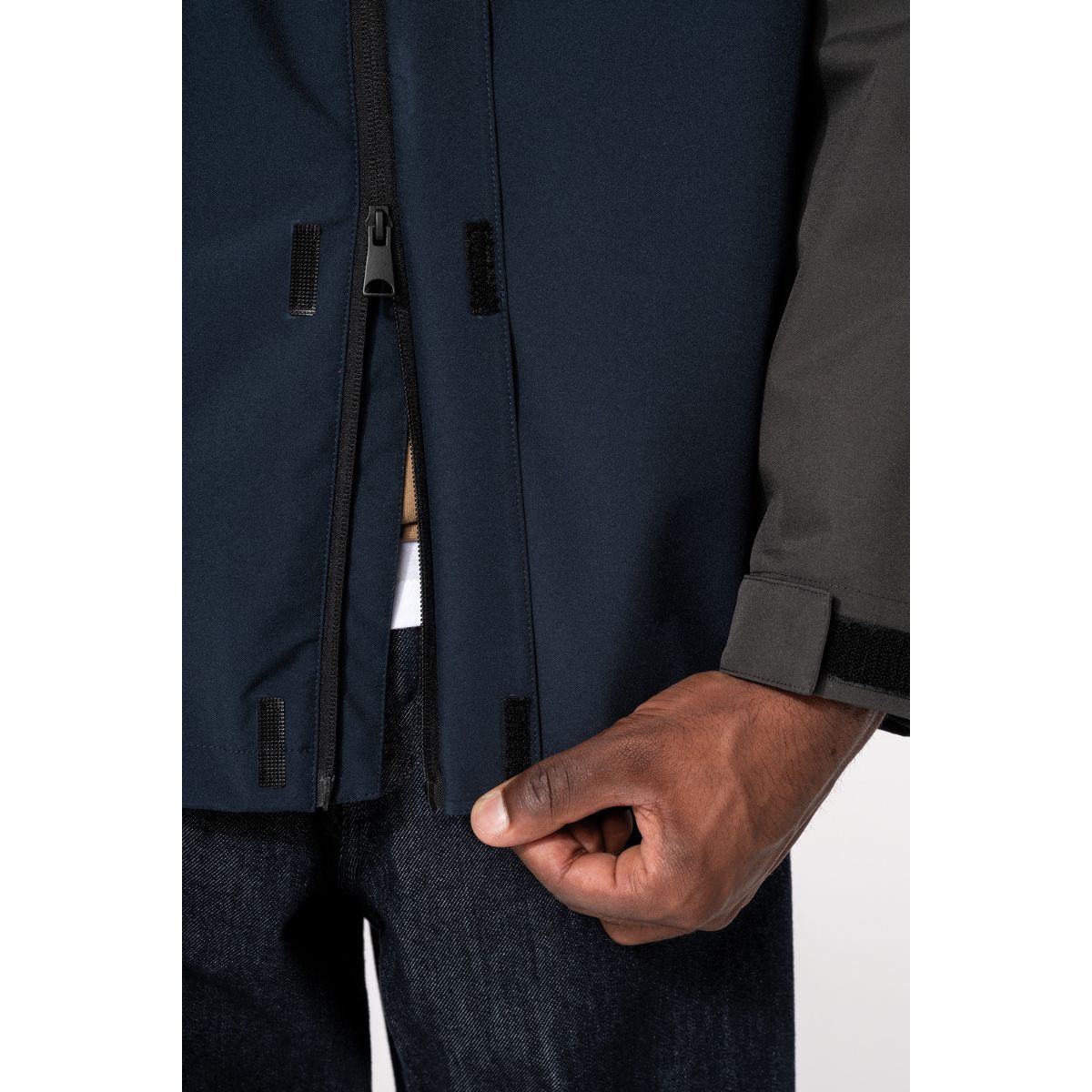 Klasický střih, voděodolná (4.000mm vodní sloupec), prodyšná (3.000g/m² za 24h), kapuce se šňůrkou a zarážkou, tunýlek na šňůrku na lemu se zarážkou uvnitř, nastavitelné manžety se suchým zipem, 2 boční kapsy se zipem, uvnitř kapsa na mobilní telefon, podlepené švy, zip uvnitř k připevnění vnitřní bundy, vnitřní bunda: 2 boční kapsy se zipem