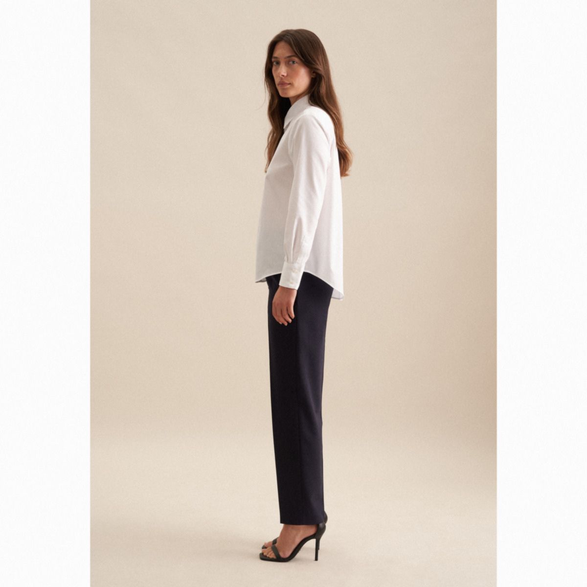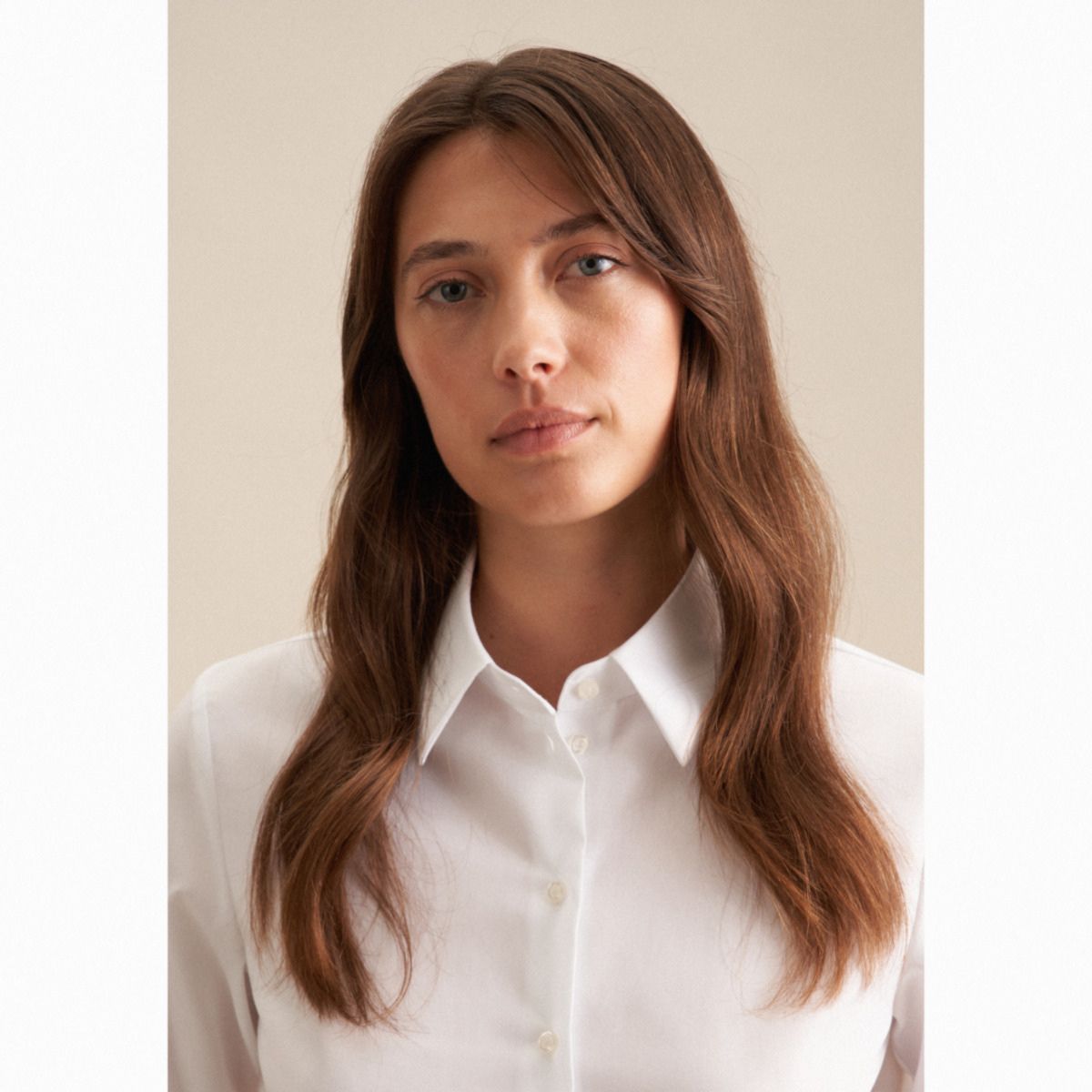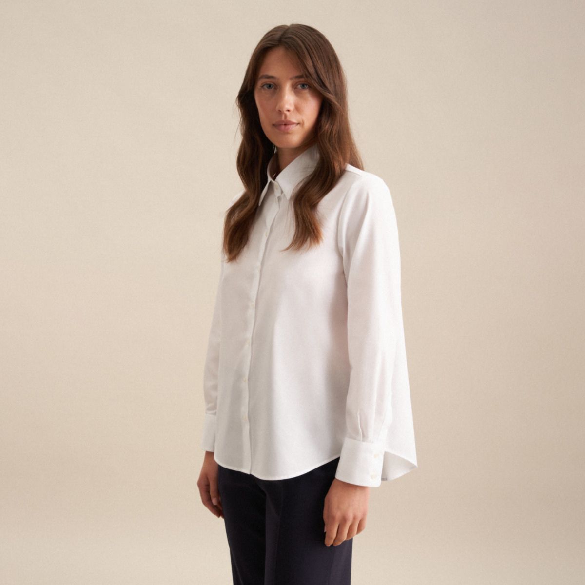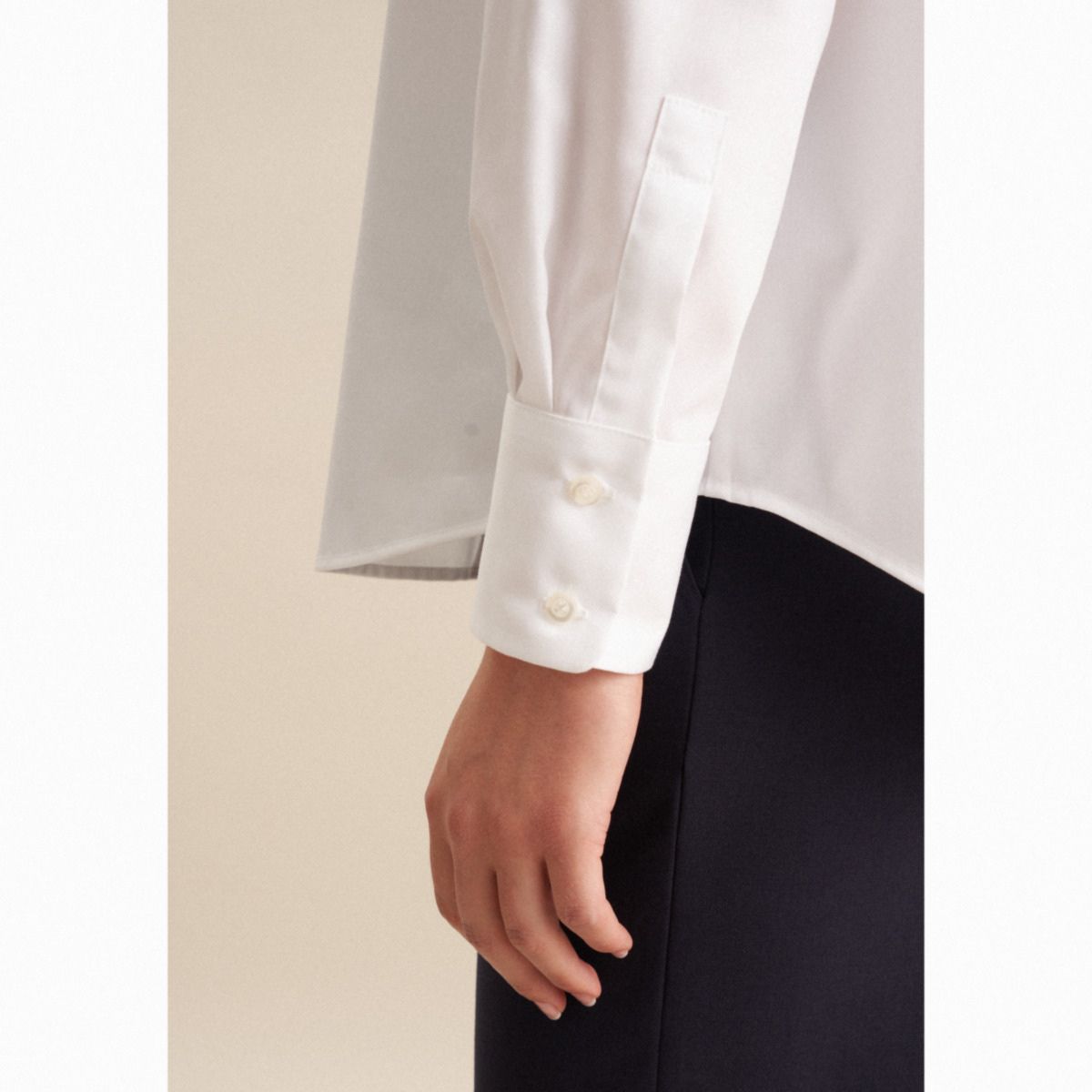 Rozšířený střih ve tvaru písmene A, límec Kent, manžeta se 2 knoflíky, záševky na zádech, nežehlivá úprava, pratelné na 40°