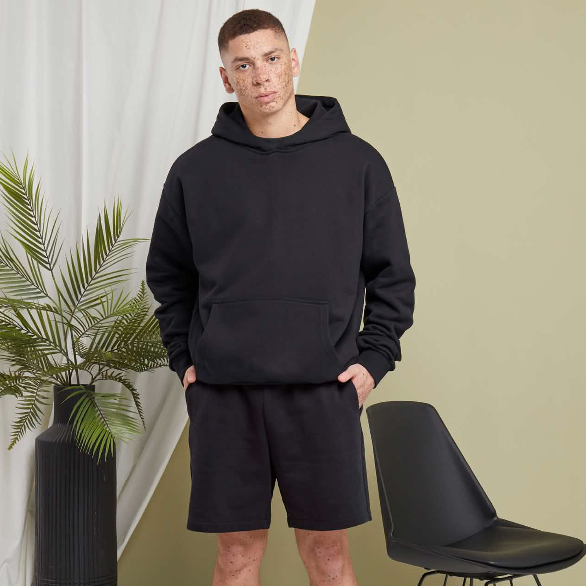 Delší střih, oversize, extra dlouhé rukávy, široké žebrované manžety na rukávech a lemu, klokaní kapsa, neutrální velikostní štítek, pratelné na 30°