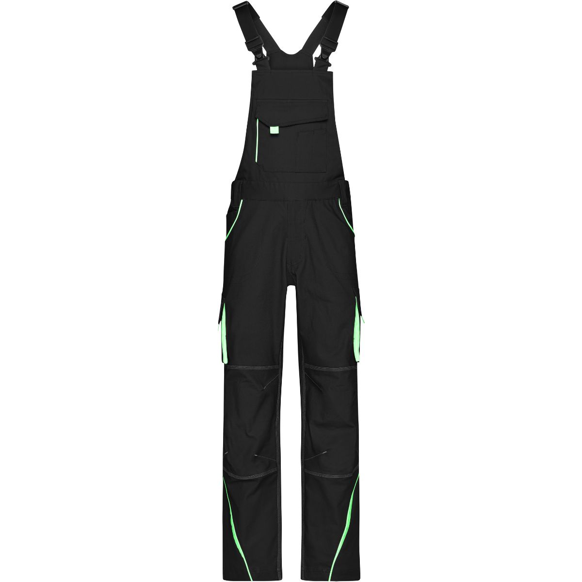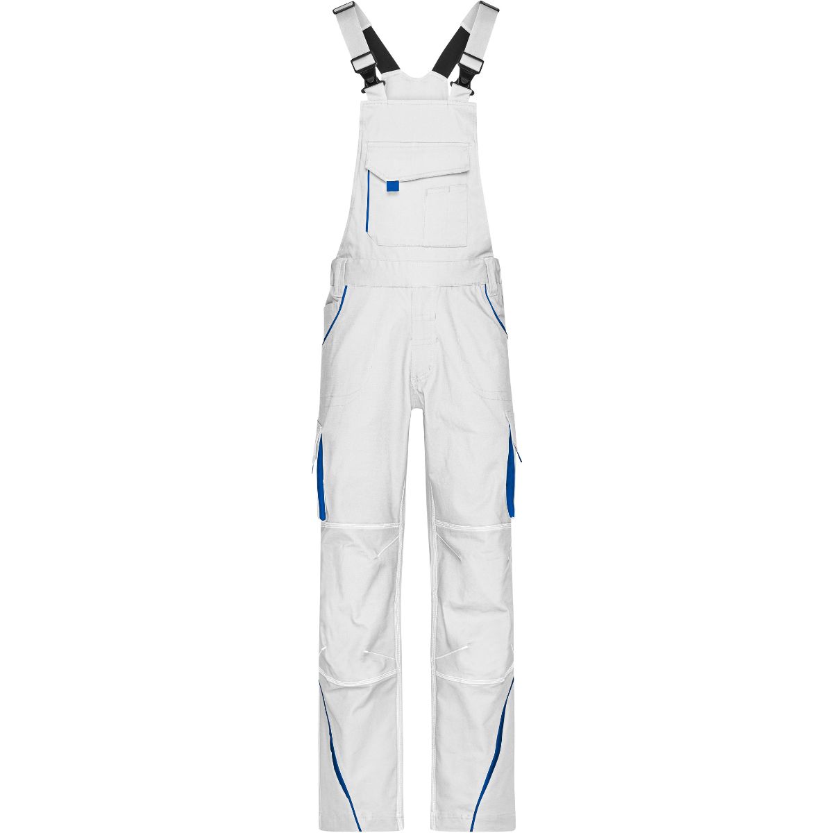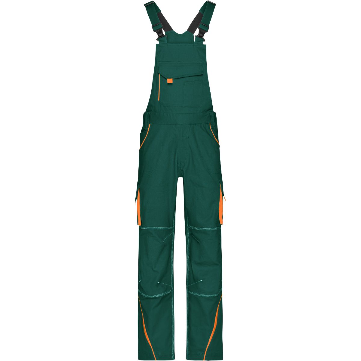 Pohodlné nošení díky ergonomickému střihu a podílu elastanu, nastavitelný lacl s elastickými popruhy, elastický pas s poutky na opasek, zakryté knoflíky a zipy, zasouvací kapsy, různé kapsy na nářadí, kapsa na pravítko, kapsa na mobilní telefon a kapsa na pero, prostorná kapsa se zipem uvnitř na laclu, 3-tý šev odolný proti roztržení, elastické lehké kvalitní plátno, reflexní prvky (bez ochranné funkce) na přední a zadní straně, pratelné na 60°, lze sušit v sušičce při nízké teplotě, normální velikosti art.č. 02.0848